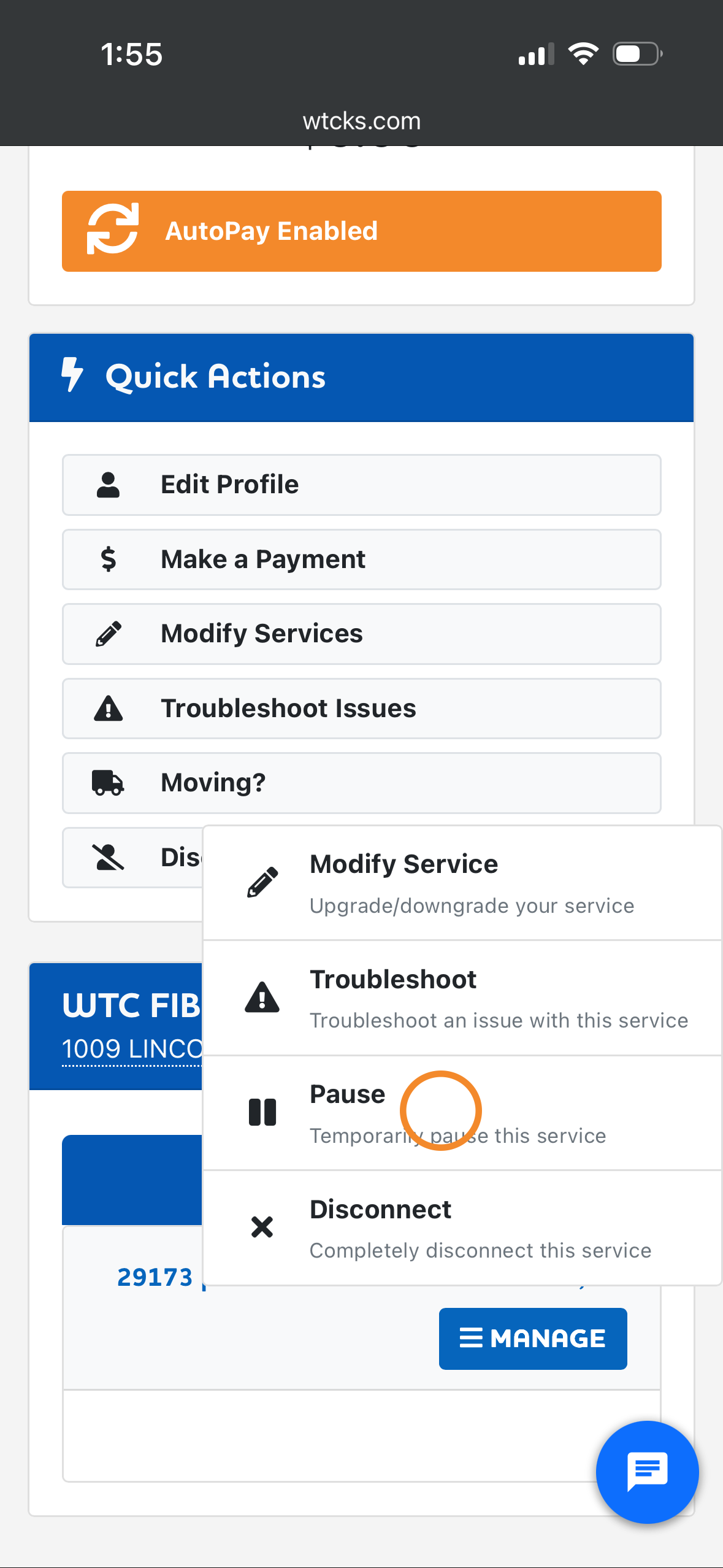 Once you've logged into your myWTC portal, you can pause any service! Follow along below to learn how. As always, if you have any questions, call or text 785-456-1000, or email support@wtcks.com.