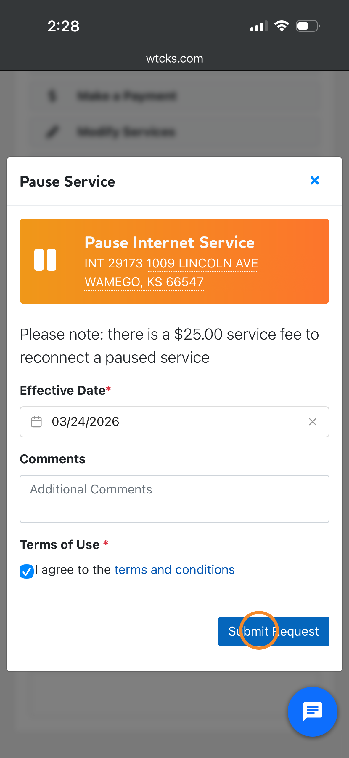 Step 2: Choose the effective date you would like your service to be paused. Check the terms and conditions box. Then click submit request.