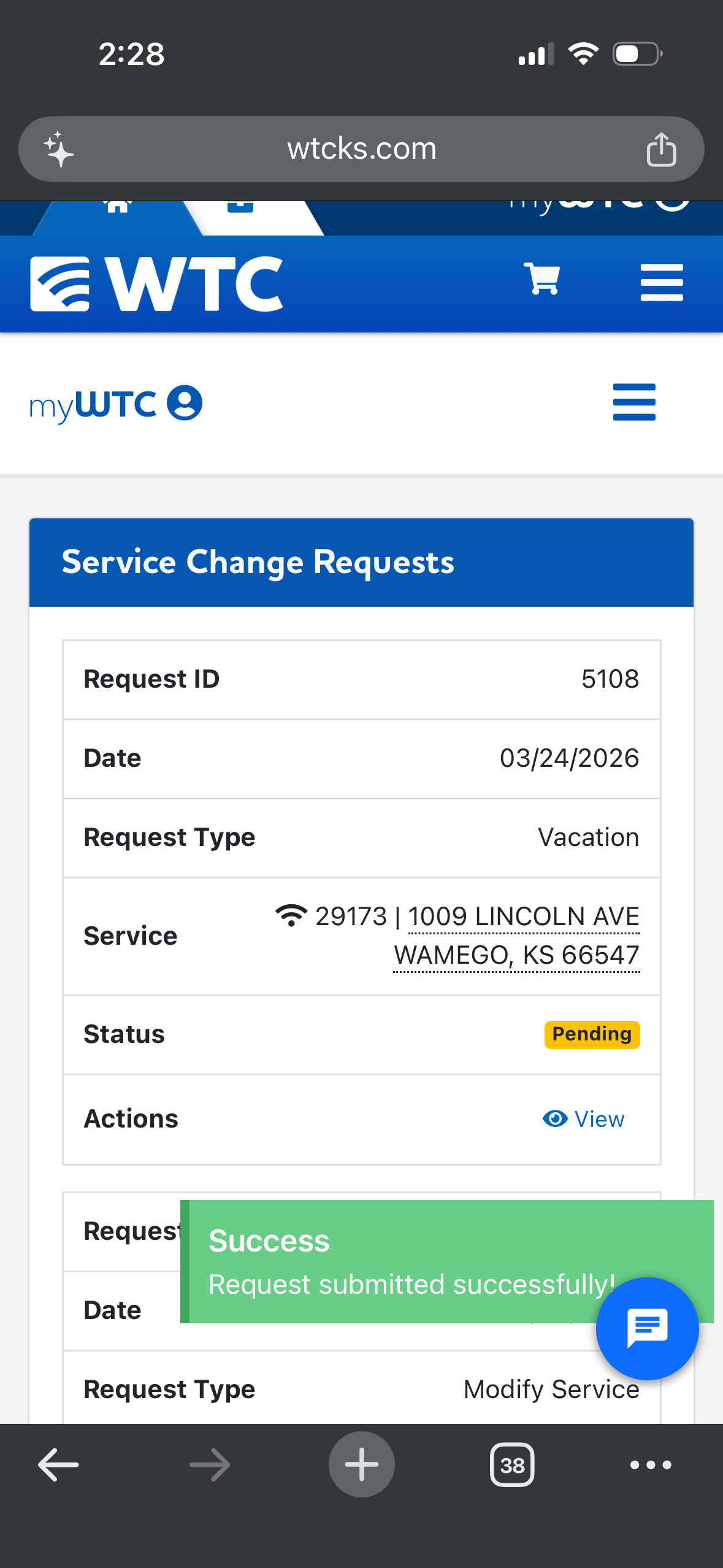 Step 3: Your request will be added to your service change requests page. When the service has been paused, the status will change to completed.