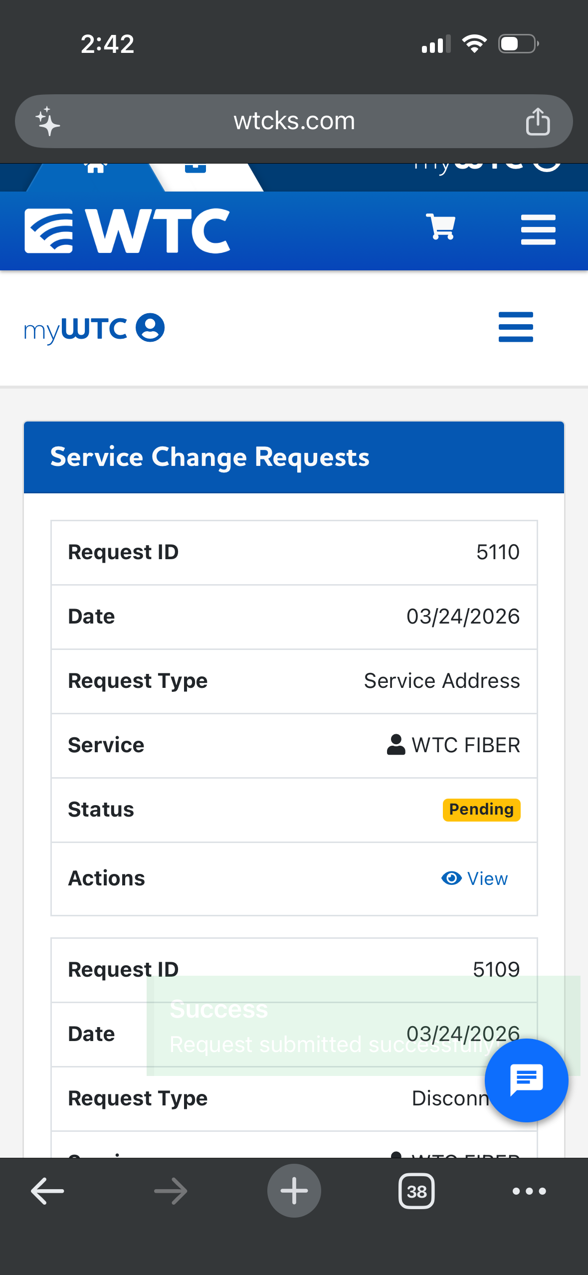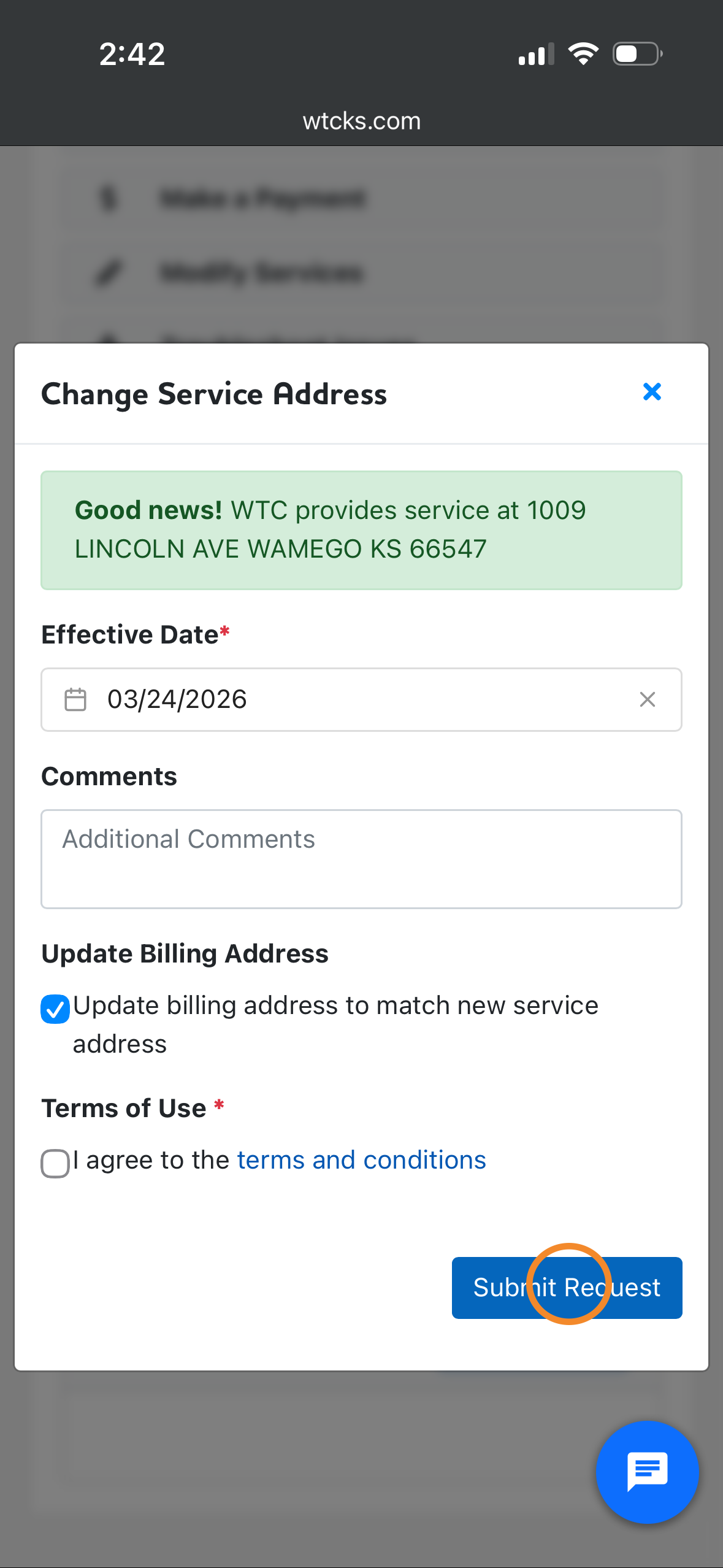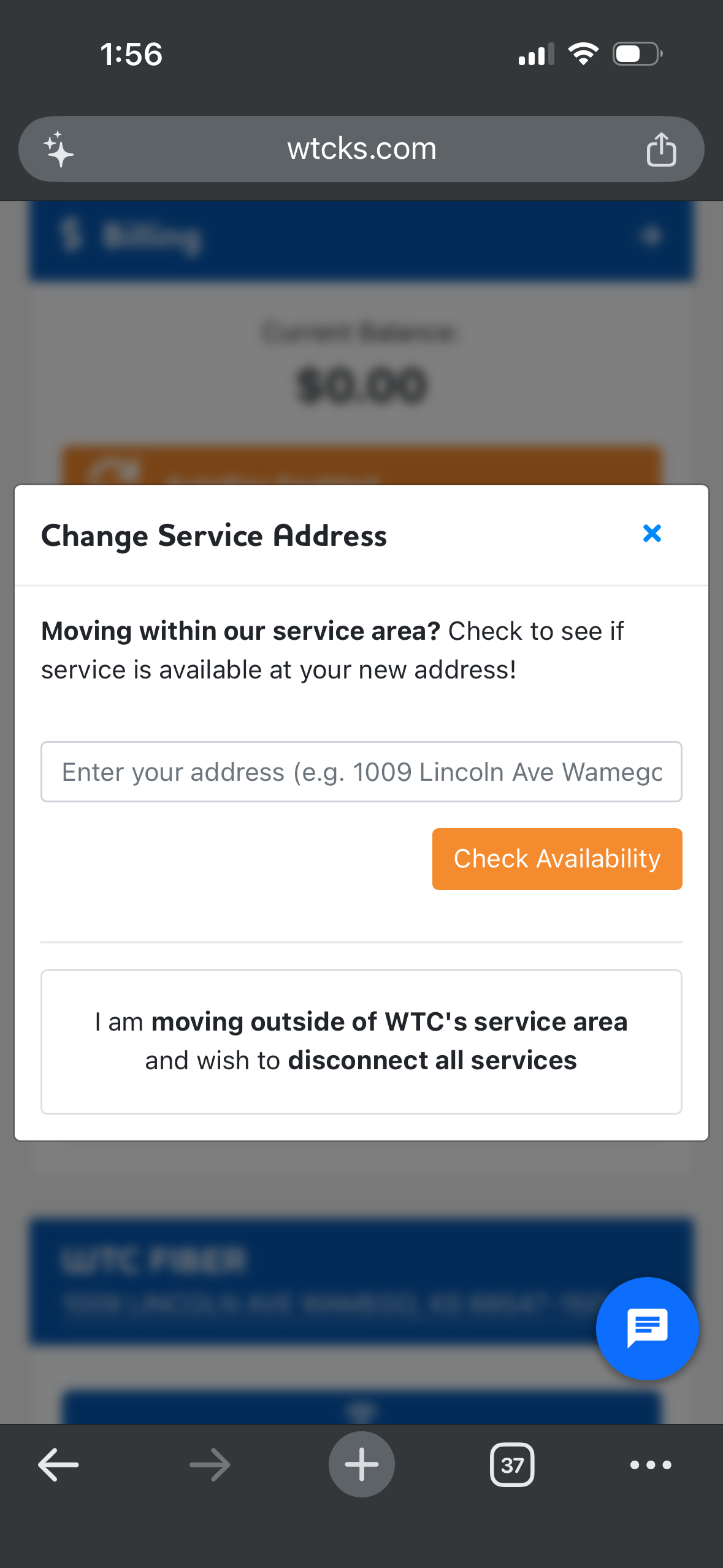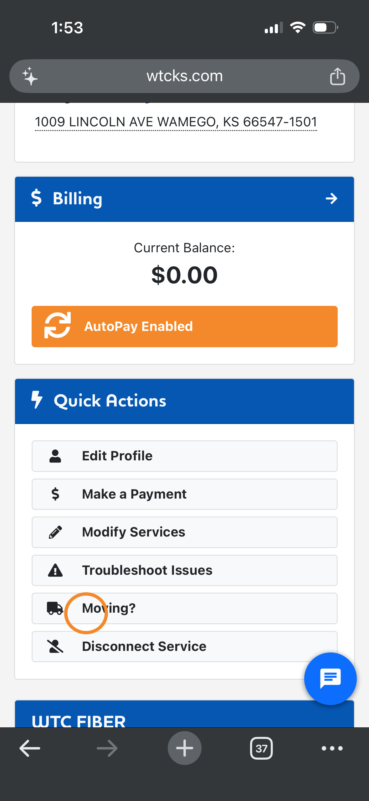 Once you've logged into your myWTC portal, you can easily transfer your service to a new address! Follow along below to learn how. As always, if you have any questions, call or text 785-456-1000, or email support@wtcks.com.